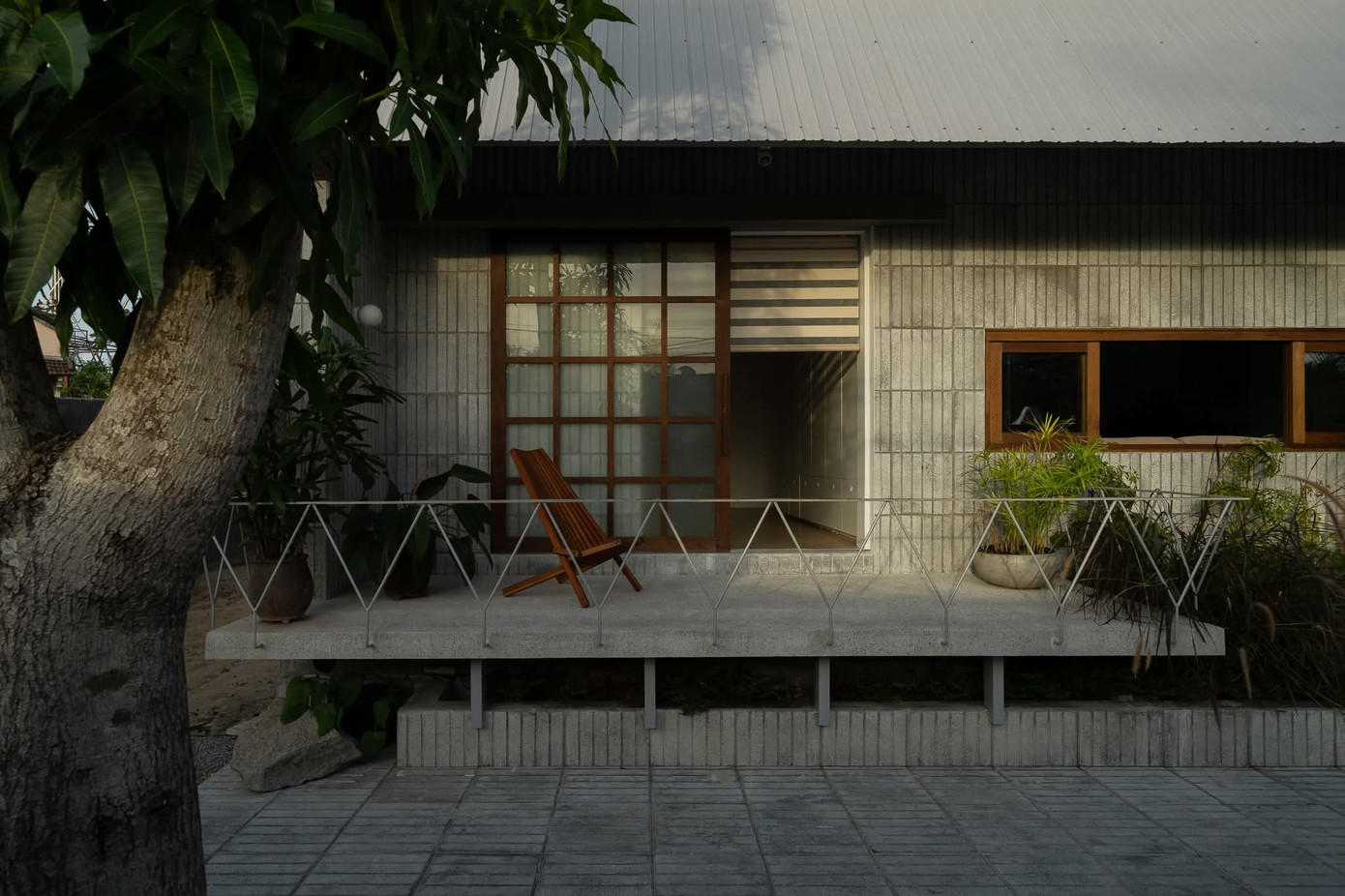 Trên nền móng bê tông cốt thép và trong giới hạn kinh phí, kiến trúc tập trung vào hệ mái tôn và hàng hiên bao quanh, kết hợp vật liệu quen thuộc như gạch terrazzo để tạo hiệu quả thẩm mỹ giản dị mà bất ngờ.