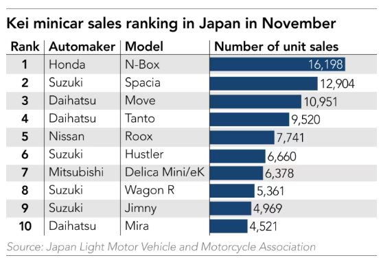 Doanh số các mẫu xe kei tại Nhật Bản trong tháng 11. Theo Nikkei