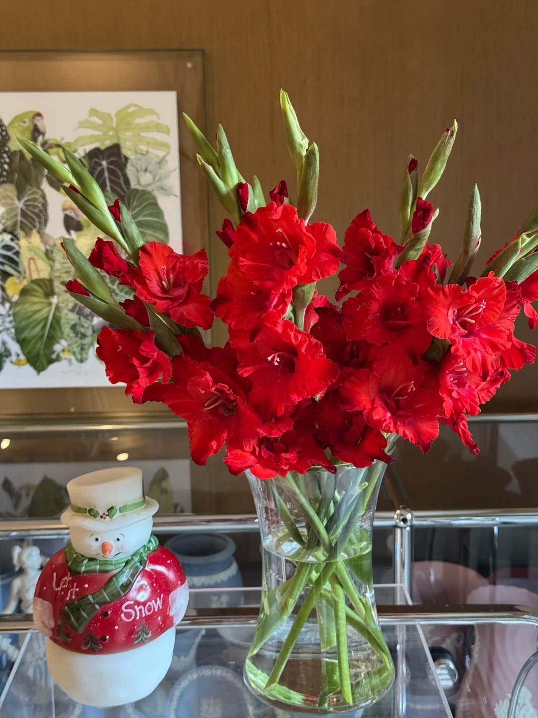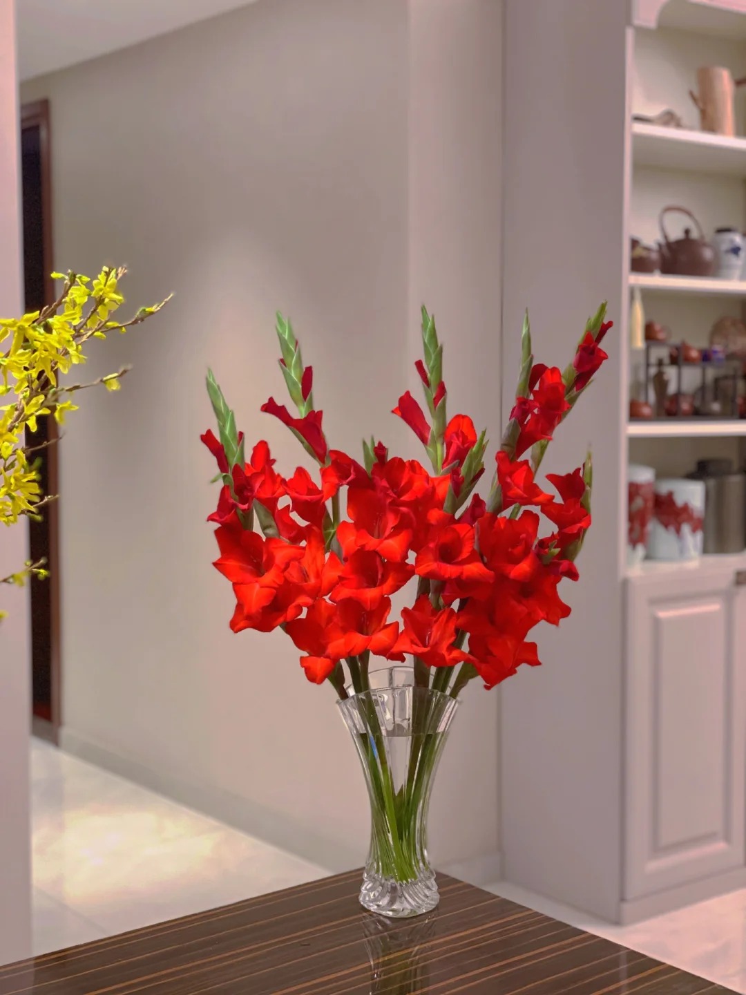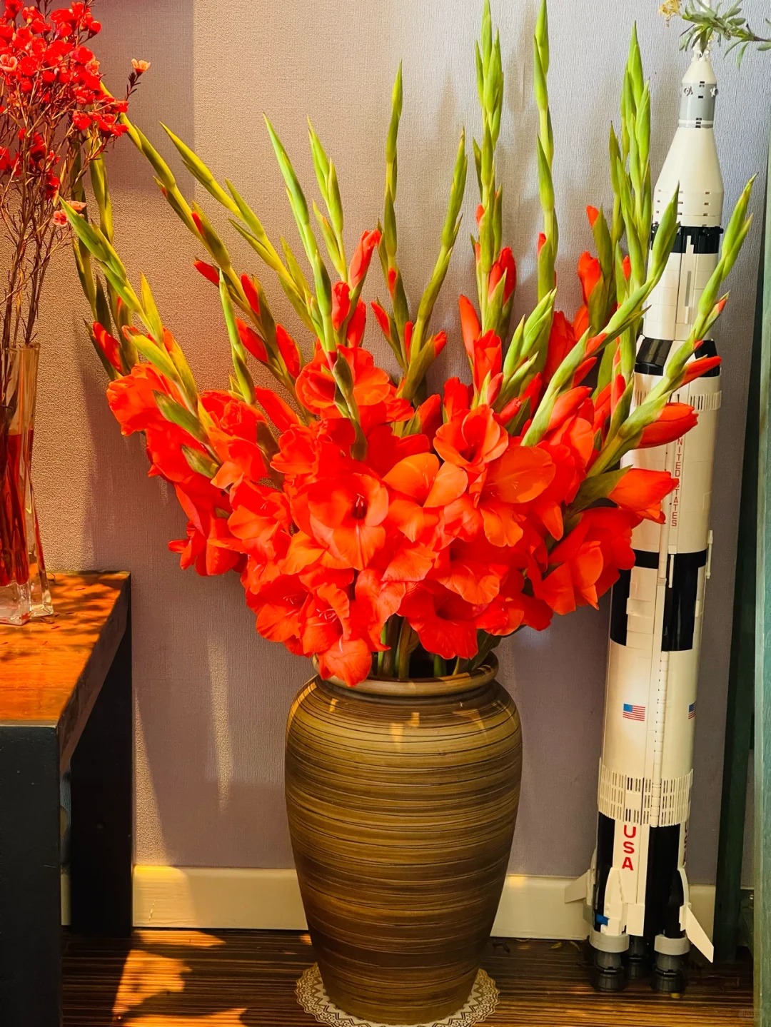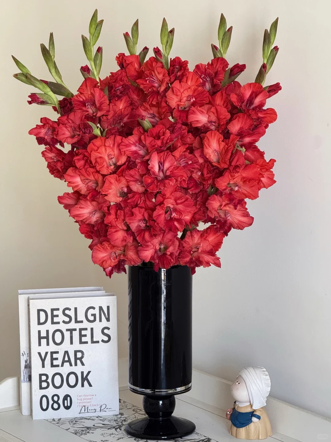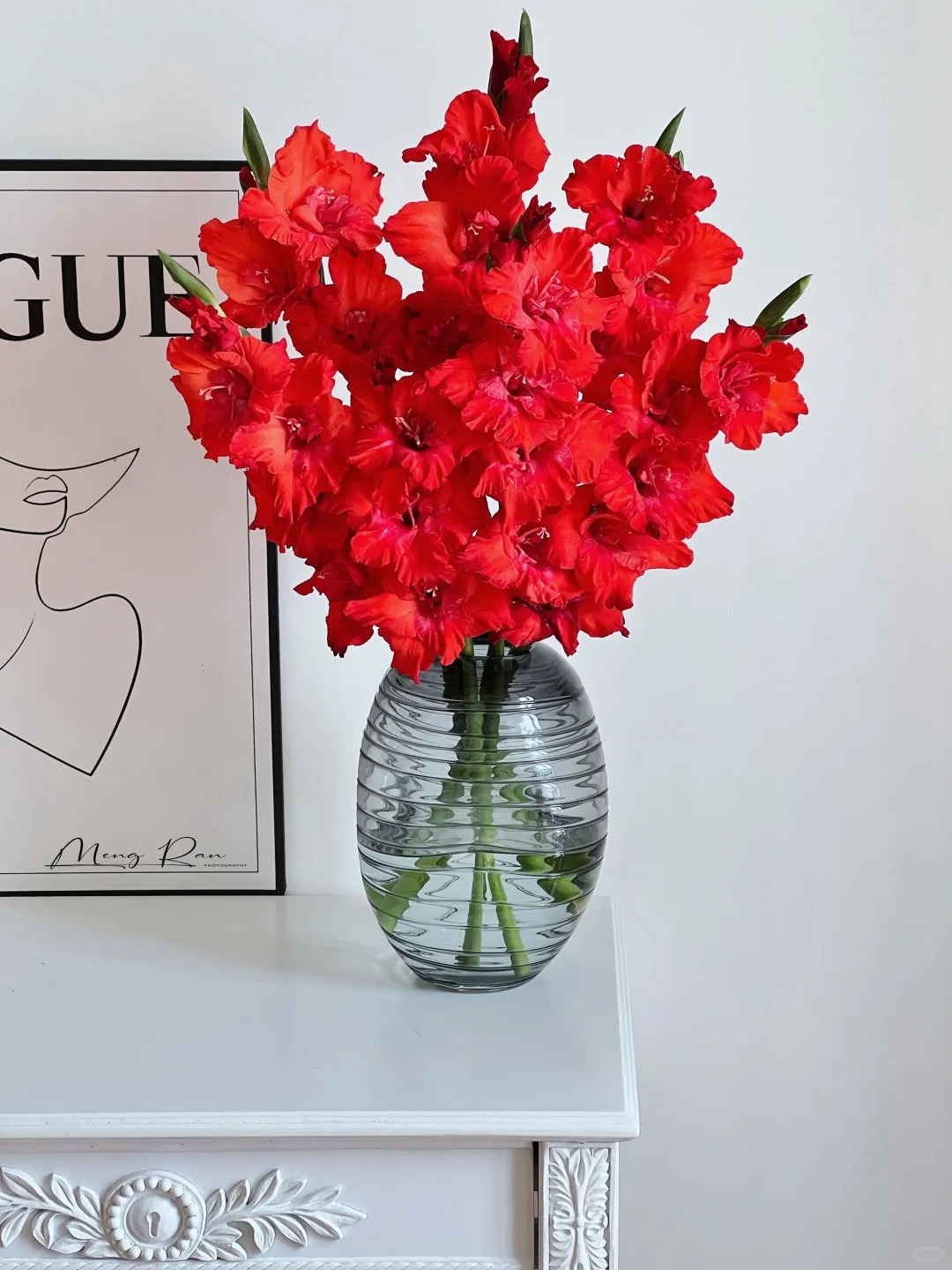 Thứ hai, với những căn hộ có phong cách decor hơi hướng vintage, Mỹ cổ điển hoặc nội thất gỗ tối màu, một bình lay ơn đỏ chính là điểm nhấn hoàn hảo. Màu đỏ nồng nàn giúp không gian có chiều sâu hơn, trở thành tiêu điểm thị giác cực kỳ bắt mắt bên cạnh kệ tivi hay bàn trà. Và cuối cùng, quan trọng nhất là "độ lỳ" của hoa. So với hoa hồng vốn đỏng đảnh và dễ héo, lay ơn đỏ bền bỉ hơn nhiều, bạn có thể thong dong chơi hoa suốt cả tuần dài mà sắc hoa vẫn rực rỡ.