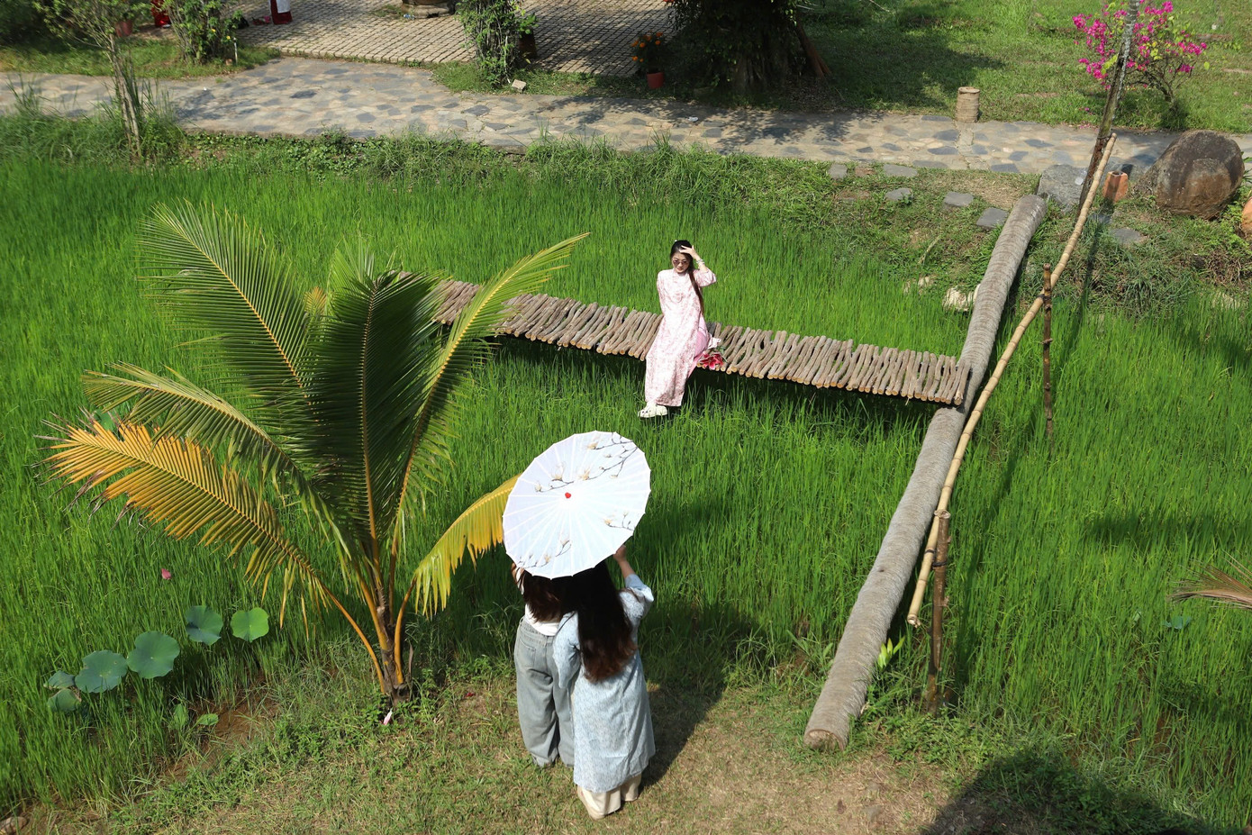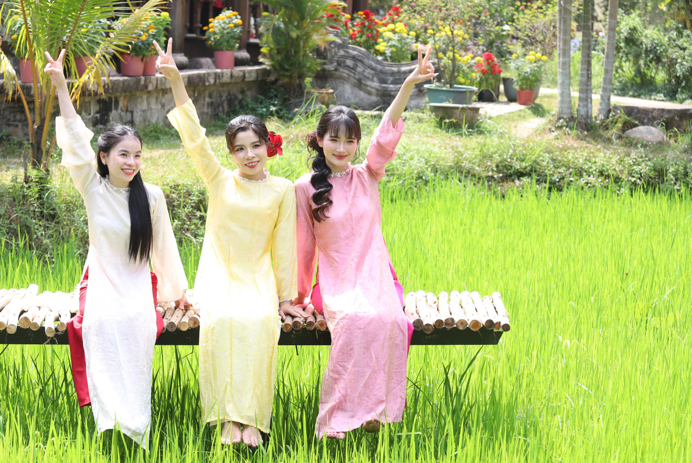 Nhóm 3 cô gái thích thú tạo dáng chụp ảnh bên ruộng lúa xanh mơn mởn ngay trong khuôn viên Bảo tàng Áo dài.