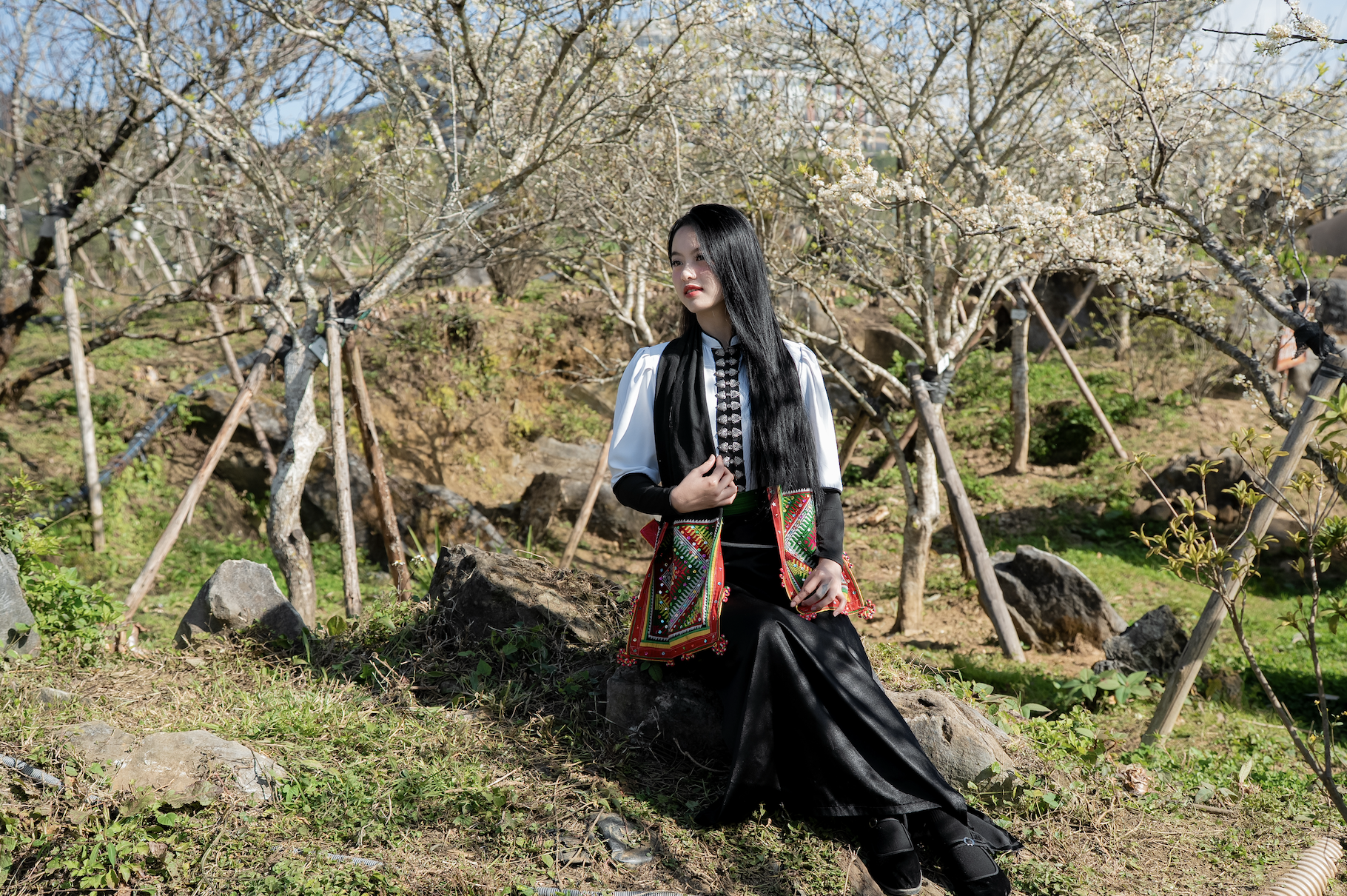 Khi những đợt gió lạnh vẫn còn vương vấn trên từng phiến đá, sắc hoa mận bung nở đã mang theo cảm giác mùa xuân rất rõ ràng. Giữa nền trời trong xanh, màu trắng tinh khôi của hoa nổi bật đến mức chỉ cần đứng vào khung hình là đã có ngay những bức ảnh đầy chất thơ.